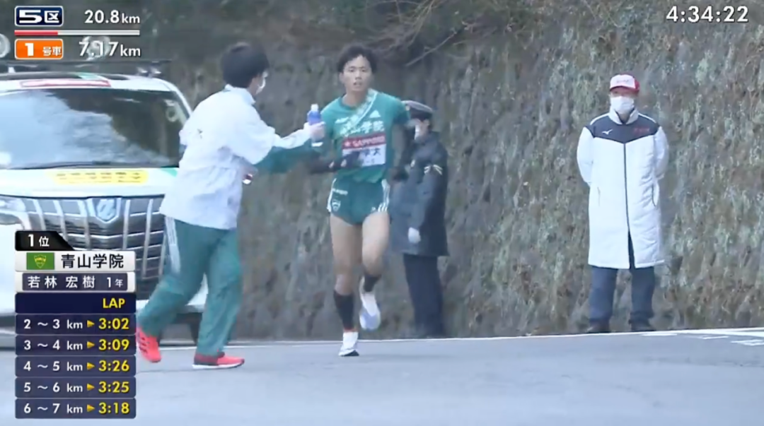 18 公里,太田苍生开始提速,逐渐拉开与丹所健的距离,让青山学院大学第一次排名第一。