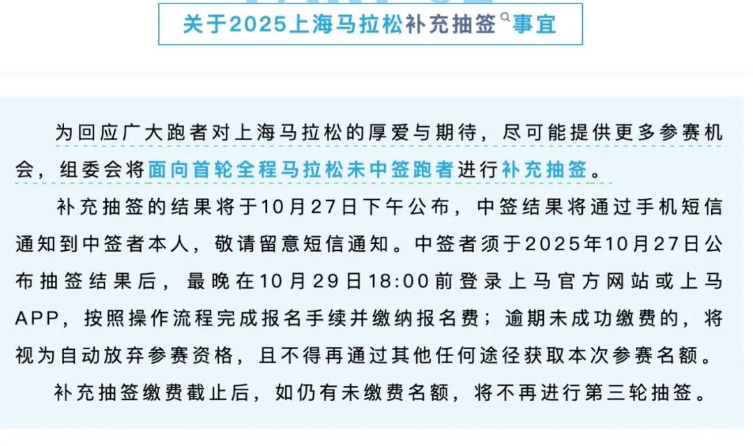 中签者须于 2025年 10 月 27 日公布抽签结果后,最晚在 10 月 29 日 18:00 前登录上马官方网站或上马 APP,按照操作流程完成报名手续并缴纳报名费;逾期未成功缴费的,将视为自动放弃参赛资格,且不得再通过其他任何途径获取本次参赛名额。
