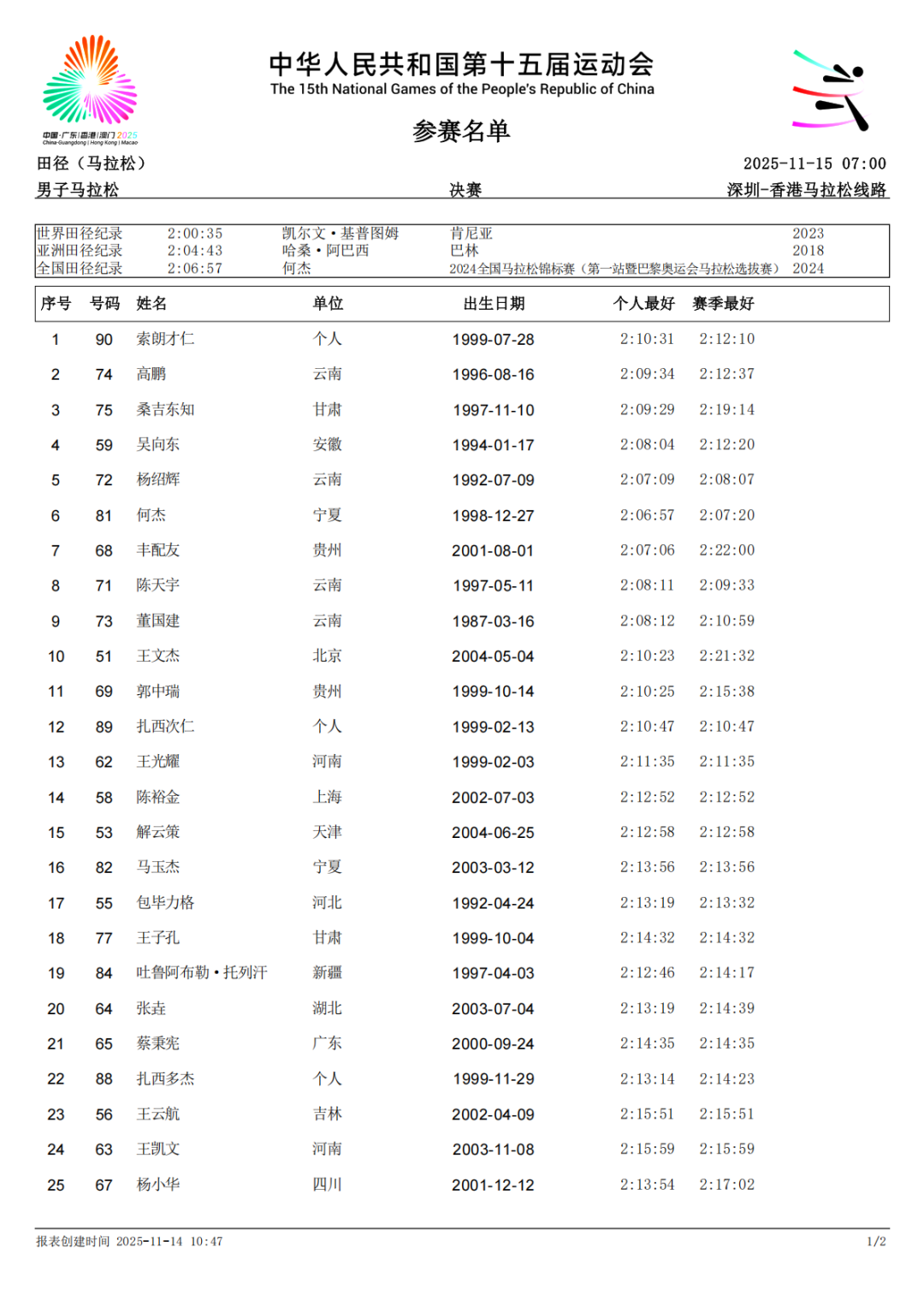 全运会男子马拉松决赛名单更新,尹顺金、李波、薛军、徐文昊四人退出 跑野 • 2025年12月3日 pm4:42 • 新闻 • 阅读 67907 第十五届全运会男子马拉松决赛将在明天(11 月 15 日)上午 7:00 鸣枪起跑,目前所有参赛运动员已经完成报到和参赛确认、装备检查以及技术会议等相关流程,只等最终决战。 全运会官网也更新了最新的男子马拉松决赛选手名单,和之前一个版本的 40 人名单相比,名单上少了 4 人,分别是重庆队李波、青海队薛军和尹顺金、上海队徐文昊,4 人之中徐文昊还有场地项目需要参加,另外 3 人则彻底宣告离开本次全运会舞台了。 据同样参加全运会男子马拉松决赛的运动员朋友路边社消息,尹顺金、薛军和李波 3 人在技术会议的时候就没有出现,其中李波和薛军二人此前网络上有过一些负面传闻,但没有官方消息,目前能知道的就是这几人退出了全运会。而徐文昊退出倒是有些令人意外,或许是为了侧重场地夺牌的任务。 以下是来自全运会官网最新的男子马拉松决赛 36 人名单,广东队蔡秉宪将作为东道主选手与各省市高手同场竞技,还有此前遭遇跟腱断裂重新恢复参赛的安徽队许乐,能够走到这一步,所有选手都已经很出色、很值得被关注了,那么接下来就预祝大家能够享受比赛、赛出理想成果,加油! 图片:跑野、全运会官网 / 视觉:五年练习生 原创文章,作者:跑野,如若转载,请注明出处:https://runyeah.world/82670.html