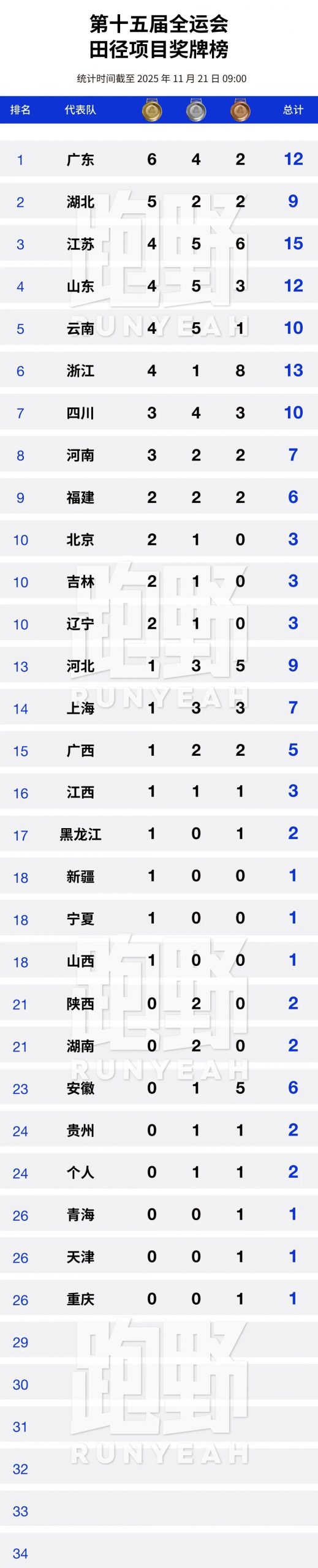 第十五届全运会田径奖牌榜 广东队 6 金位列榜首 湖北 5 金排名第二 跑野 • 2025年12月3日 pm4:57 • 新闻 • 阅读 58557 11 月 20 日晚间,第十五届全运会田径比赛收官,最后一个比赛日一共诞生了 12 枚金牌。 广东队继续捍卫荣誉,凭借两金一铜继续高居榜首,成为本届全运会田径项目最大赢家。男子三级跳一金一铜、女子4×400 米再添一枚金牌。 湖北队在男女 4×100 米接力赛中双双夺冠,助力该省直接晋升 4 个席位,从原本的第六位最终以 5 枚金牌排在第二位。 江苏队则凭借 1 枚金牌、两枚银牌以及三枚铜牌,最终 15 枚奖牌排名总数第一。 凭借男子万米递补,马文良获得铜牌,助力青海队终于实现了奖牌榜 0 的突破。 本届全运会一共 28 个省、自治区和直辖市拿到了田径项目的奖牌。辽宁队的三块奖牌全部都由于水庆夺得,宁夏队的一枚金牌是何杰拿到的,而代表个人出战的次仁措姆拿到了一银一铜的成绩。 第十五届全运会田径最终奖牌榜排名,跟你预想的有不一样吗? 文字: xx / 编辑:xx 图片:跑野大爆炸 / 视觉:五年练习生 原创文章,作者:跑野,如若转载,请注明出处:https://runyeah.world/82991.html