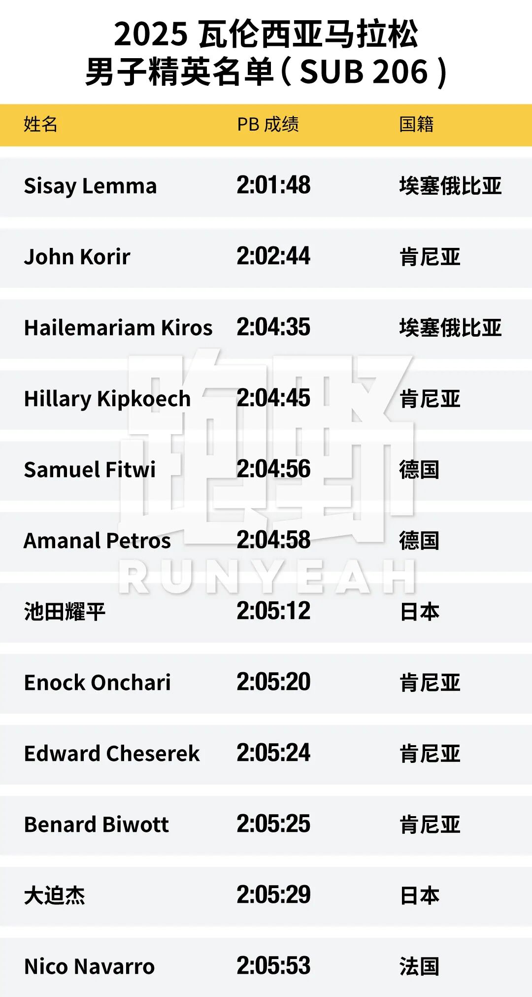 在 SUB 205 名单中,让人颇为惊喜的是“德国一哥”塞缪尔·菲特维( Samuel Fitwi )与“二哥”阿玛纳尔·彼得罗斯( Amanal Petros )齐聚瓦伦西亚。目前德国马拉松前十好成绩中,两人占据了八个。