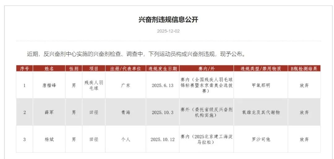 根据国家反兴奋剂中心公布的最新兴奋剂违规信息,两位马拉松运动员薛军和杨斌构成兴奋剂违规。
