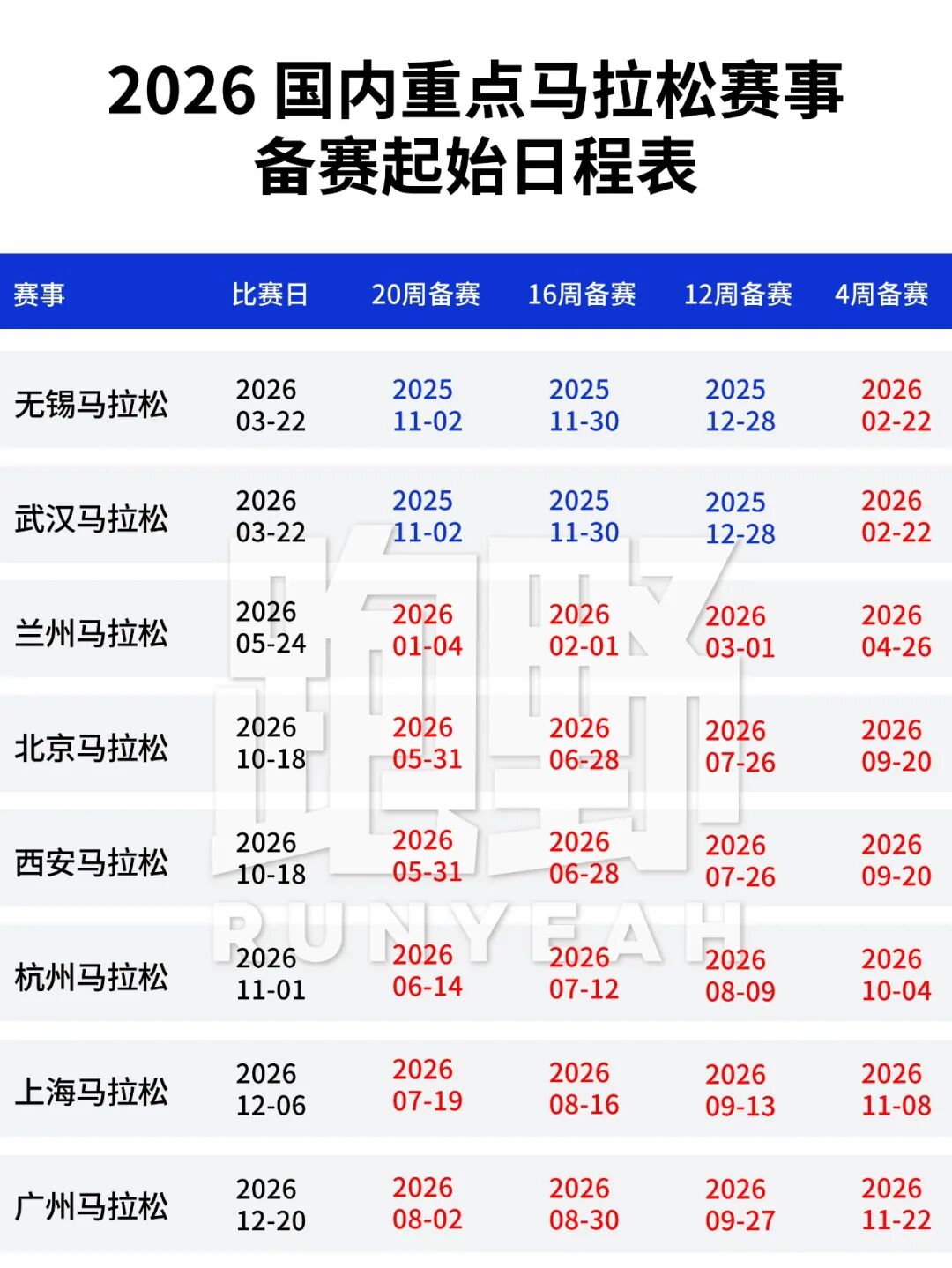 所以,训练要趁早,我们为大家带来了一份 2026 国内全程马拉松赛事(世界田径金标或白金标)的备赛日期表。不要问我为什么没有厦门马拉松,因为现在才准备,恐怕连临时突击都来不及了。