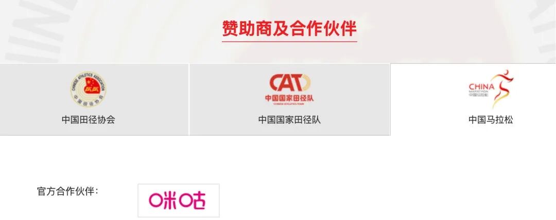 目前,中国田协官网显示,中国田径协会的官方合作伙伴是“金陵体育”;中国国家田径队的顶级合作伙伴是 Nike,中国马拉松合作伙伴目前仅有“咪咕”一项,装备类合作伙伴属缺席中。