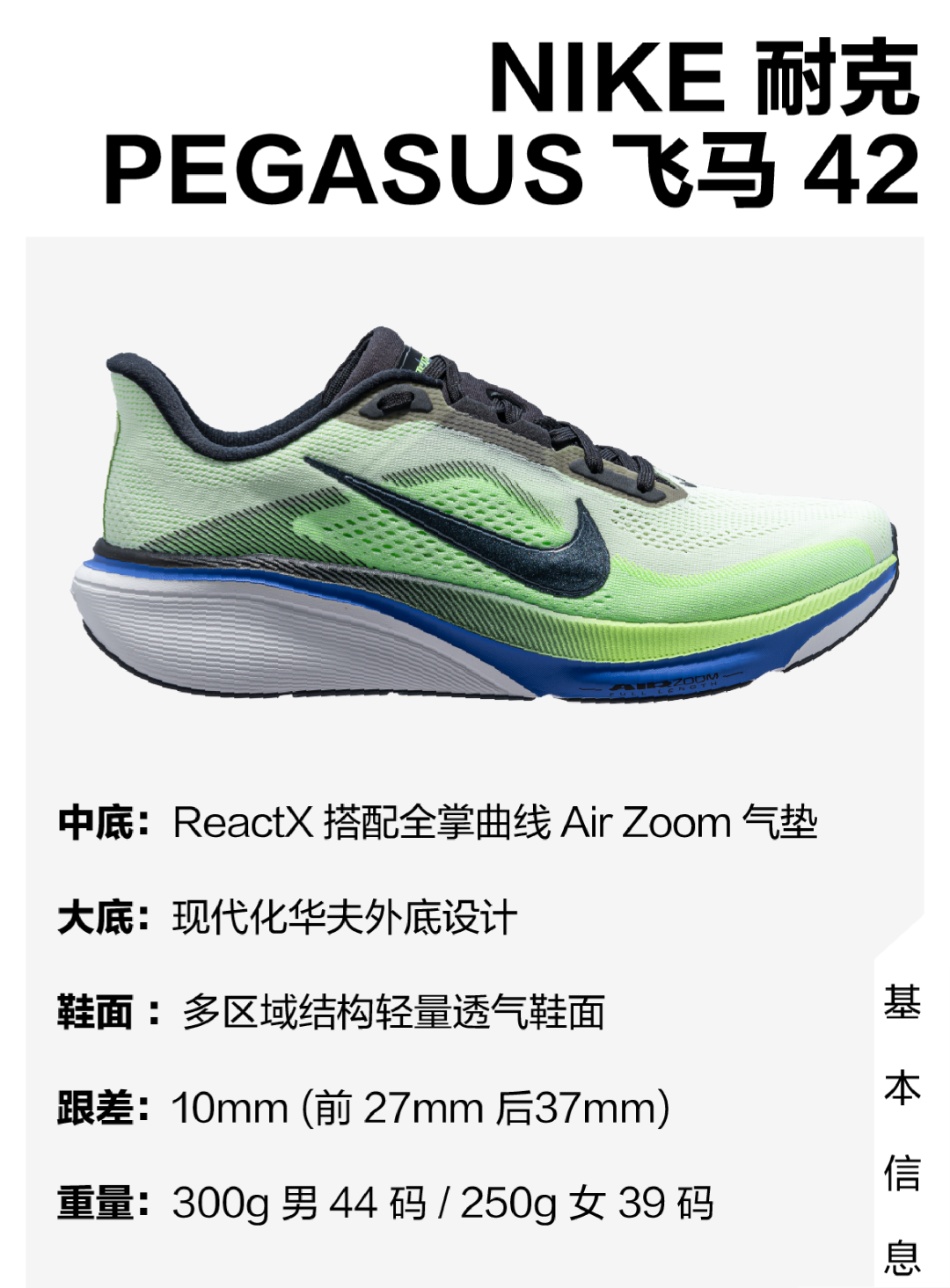 全掌弧形气垫、加宽的鞋楦还有 3 毫米的泡绵增加都会额外加大鞋重,不过,飞马 42 的重量和上一代相比,基本持平,42 码的鞋重维持在 300 克左右,而这些重量则是从鞋面、鞋带和大底等出找补回来的。